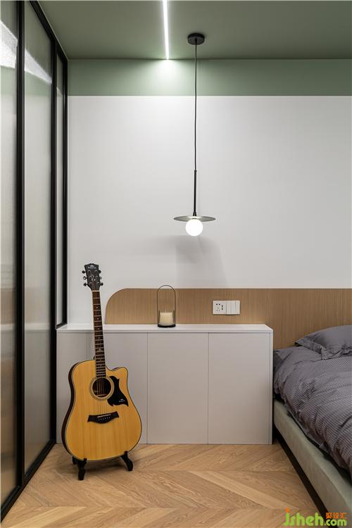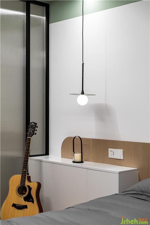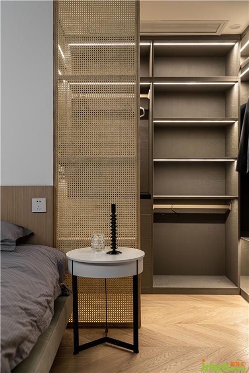 極簡圓形床頭邊幾和沉穩(wěn)簡約的藤編隔斷組合,產生了材質、色彩與線條的對比,最平常的局部小景因室內設計師混搭手法而變得有質感.