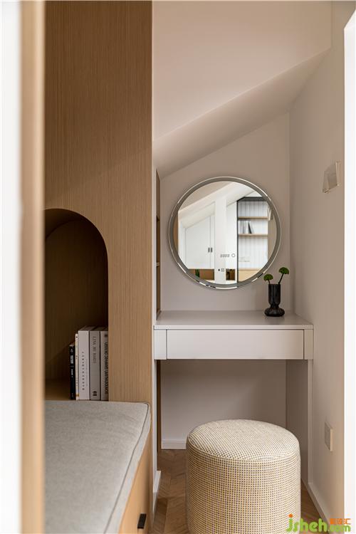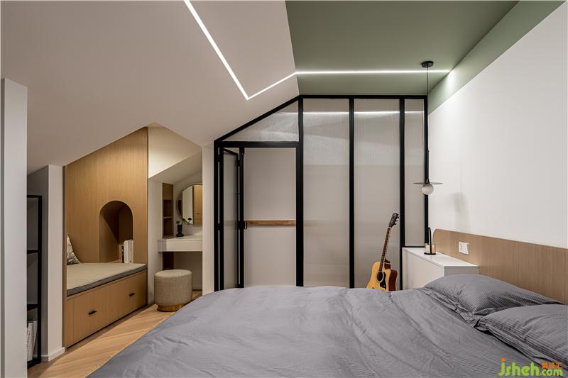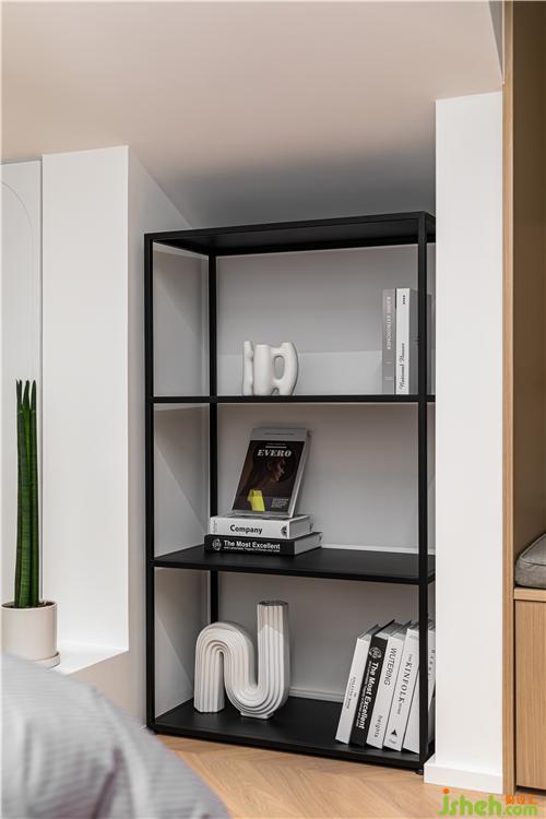 飄窗被木飾面柔和的曲線包裹,唯一的窗戶增加了空間的透氣性,弧的運用營造一種材料的美感.
