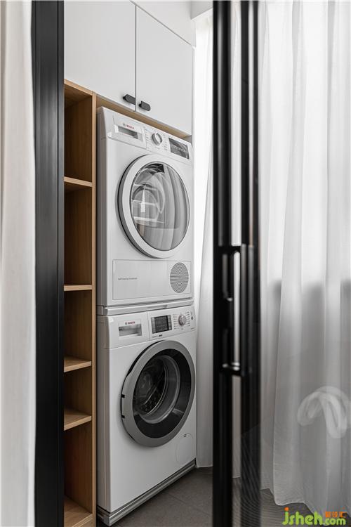 陽臺一角,白色門板與木色開放格相呼應,配合自然柔和的光線營造溫馨舒適的休閑空間.