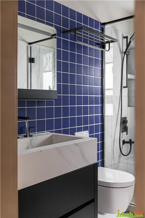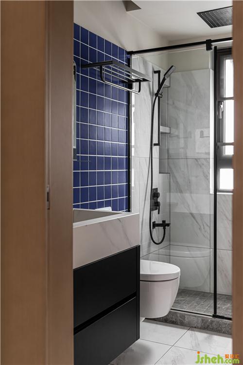 衛(wèi)生間的設計手法現(xiàn)代又高級,白色的石材磚搭配深藍色方磚,室內設計師沉穩(wěn)的色彩,凸顯出靜謐的氣氛;半高瓷磚鋪貼手法使空間更加立體.