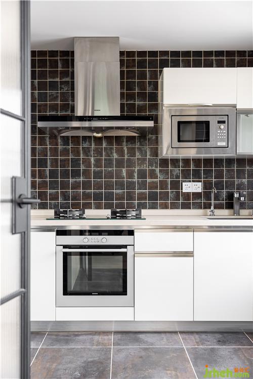 廚房保留原有狀態(tài),裝修設計定制弧形線條長虹玻璃黑色折疊門,造型復古典雅,與原廚房瓷磚相呼應.