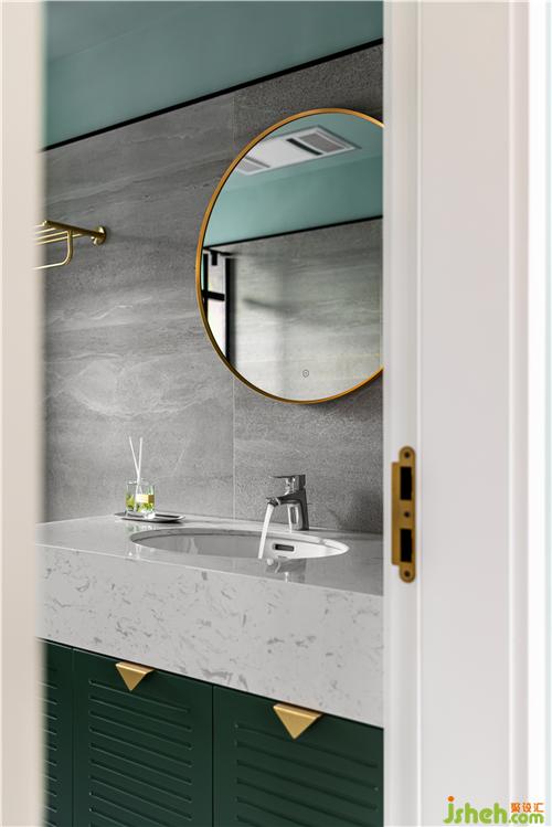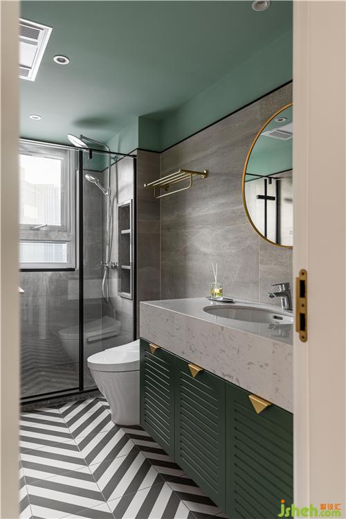 次衛(wèi)延續(xù)了公共空間的綠色調,墻面灰色石紋瓷磚與地面波浪紋花磚呼應,打造整體素雅的質感.