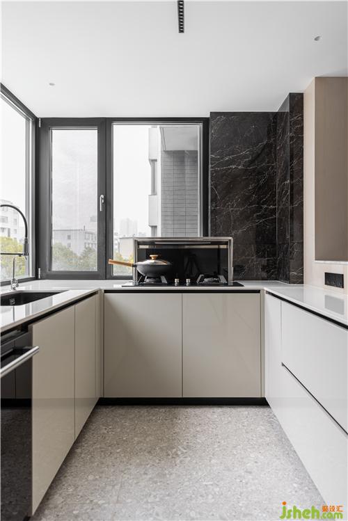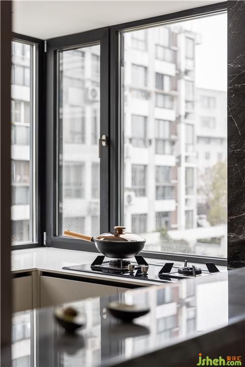 黑色大理石紋理鋪陳打底,開闊的視野窗口,讓光線無限的覆蓋整個廚房空間,亮面烤漆門板簡潔大方,營造整體而統(tǒng)一的視覺性,升降式灶臺很好的解決窗口遮擋問題.