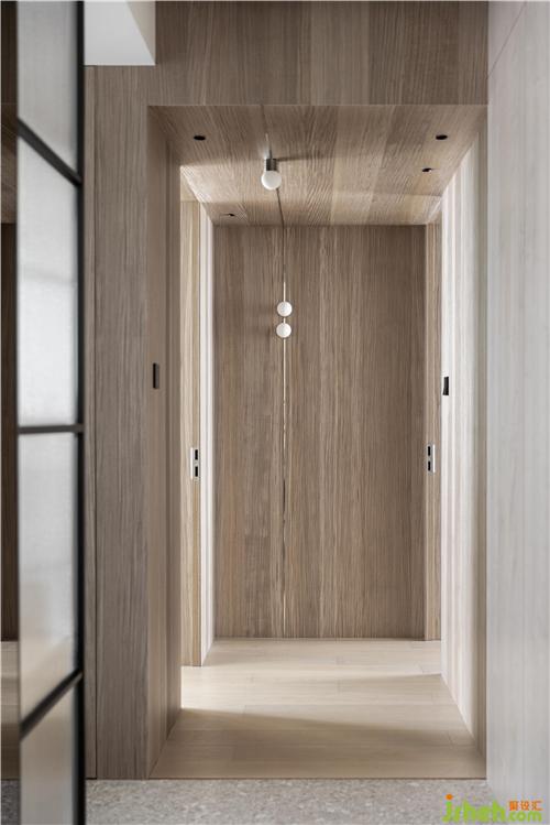 包裹式的處理手法,像一個盒子鏈接了兩個臥室,房門都是隱形處理,沒有多余的包邊、線腳,干凈利落,玄關(guān)的墻頂用一根亮面不銹鋼條貫穿切割,三個白熾球燈靈動有趣.