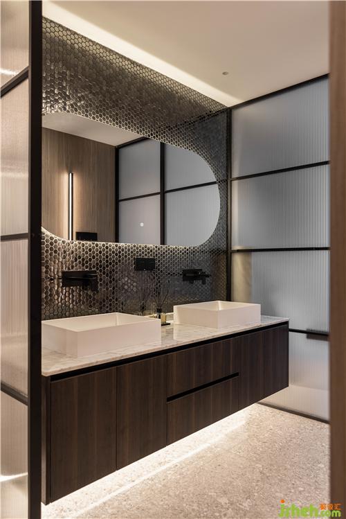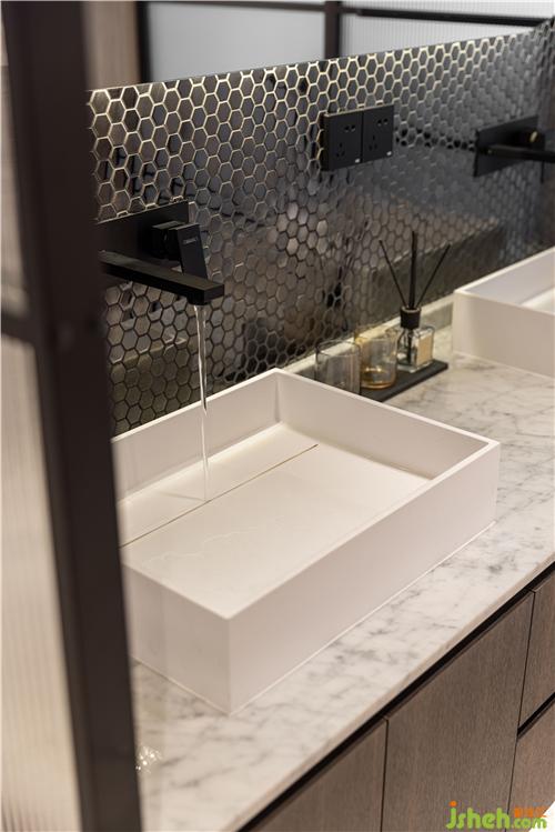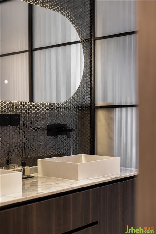 金屬馬賽克背景墻,現(xiàn)代感十足,雙臺盆的設(shè)計滿足了一家四口的需求,大面弧型鏡面讓空間瞬間清亮起來,泰州裝修設(shè)計墻排龍頭、線性下水、臺上盆,每個細(xì)節(jié)都體現(xiàn)了屋主對生活精致度的追求.