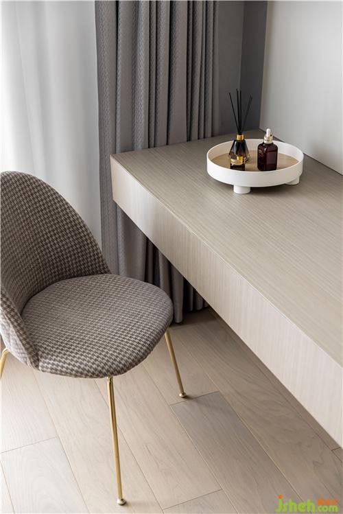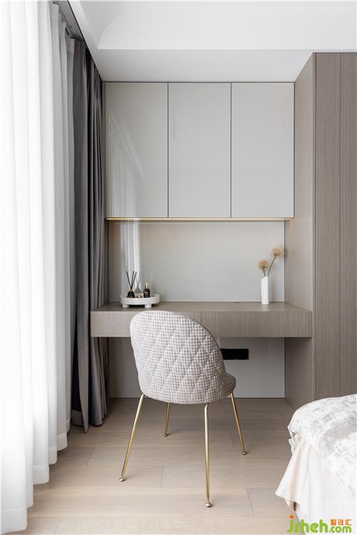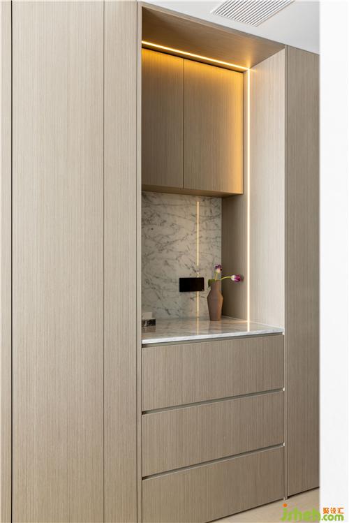 酒店式的茶臺內(nèi)嵌于整排衣柜之中,線性燈條精致著這個角落.