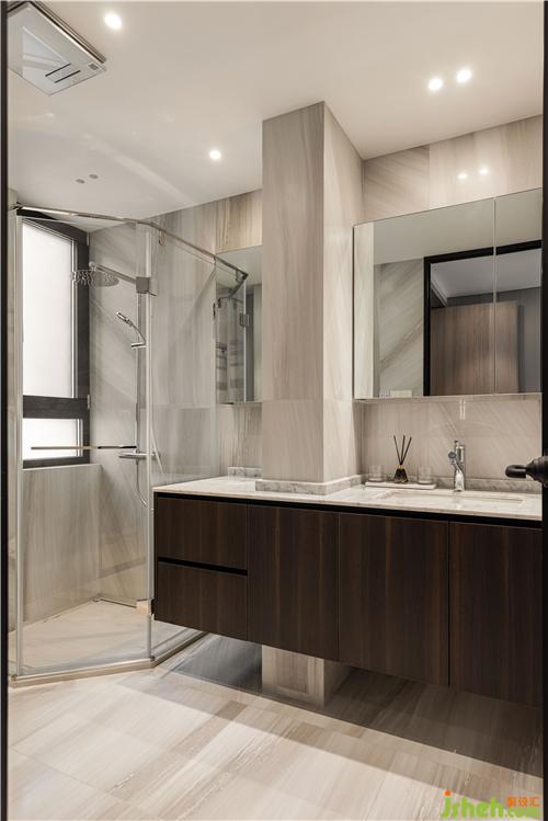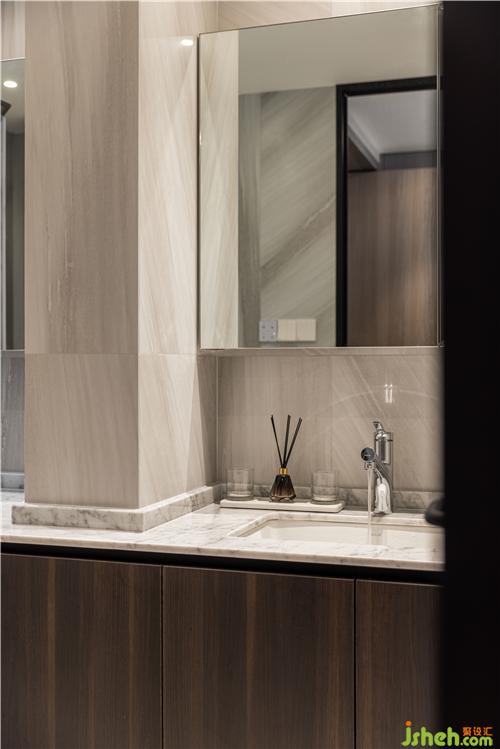 貝殼紋理的大磚整貼,空間在磚紋理的襯托下,大氣簡約,鏡柜穿插整個背景之中,細(xì)膩質(zhì)感落在空間的每個角落.
