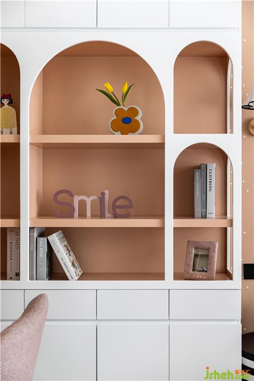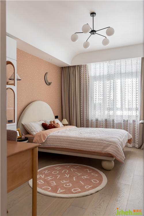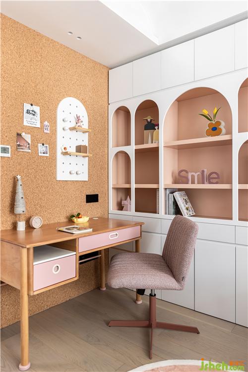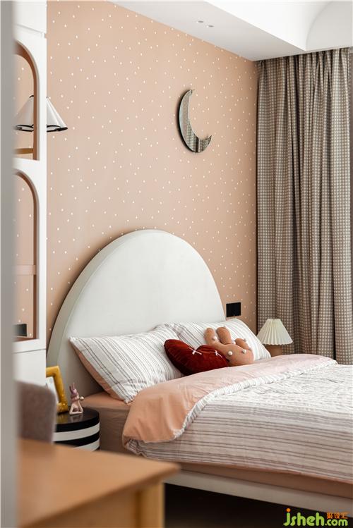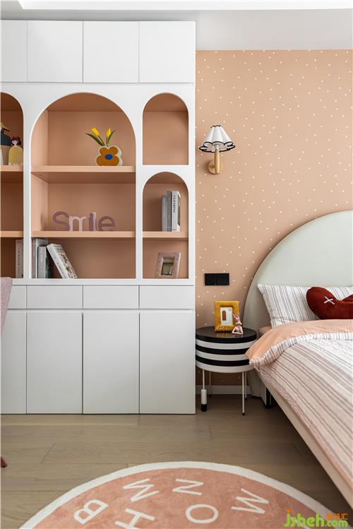 粉橙色基底與白色搭配,童話造型感的書柜,半圓弧的床頭與衣柜卡座造型生動呼應(yīng),波點(diǎn)元素更是在不同材質(zhì)上巧妙得凸顯女孩房的嬌柔可愛,泰州裝修設(shè)計(jì)讓房間可以跟隨孩子不同的階段的喜好一同成長.