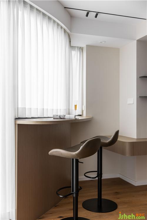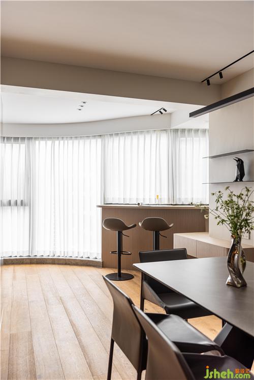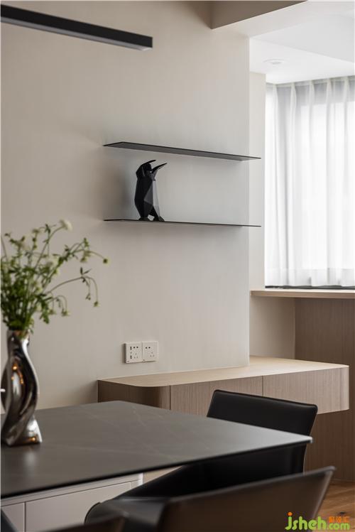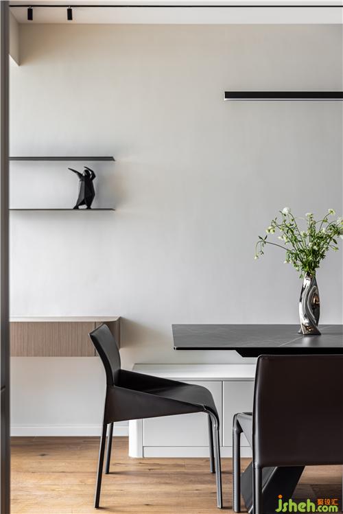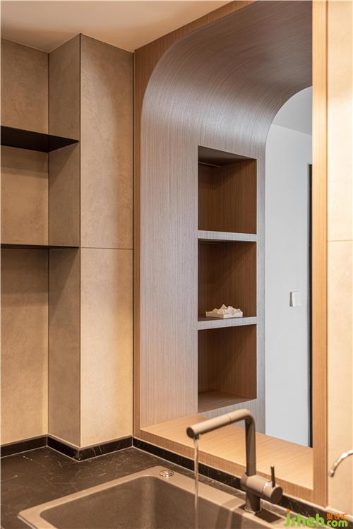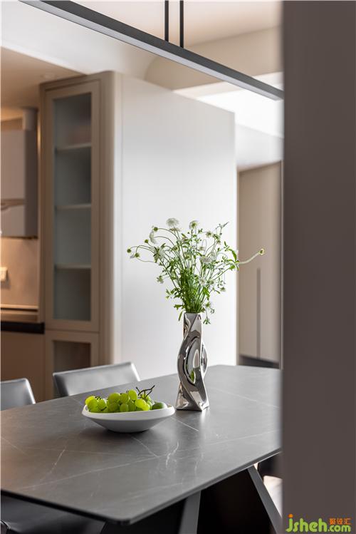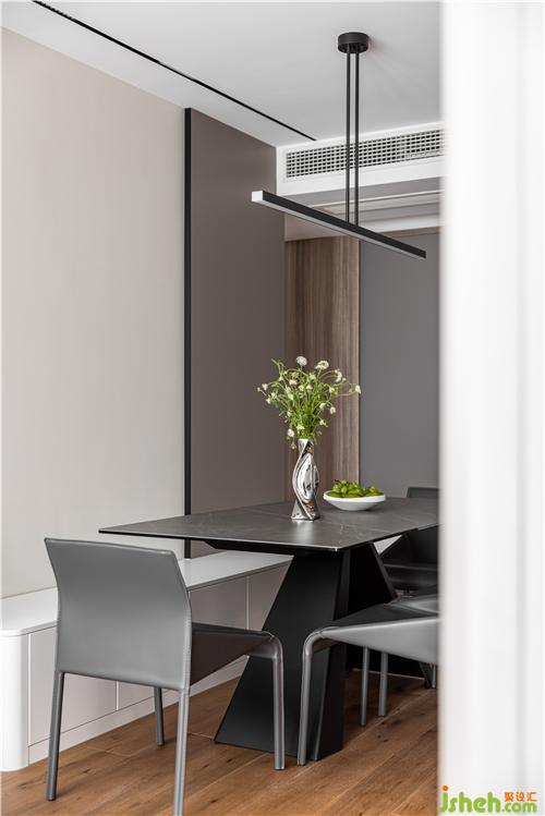 開放式廚房,打通傳統(tǒng)廚房與餐廳空間的隔閡,讓空間更具延伸感,灶臺與水池遠離客餐廳區(qū)域,避免了油煙對客餐廳的影響.