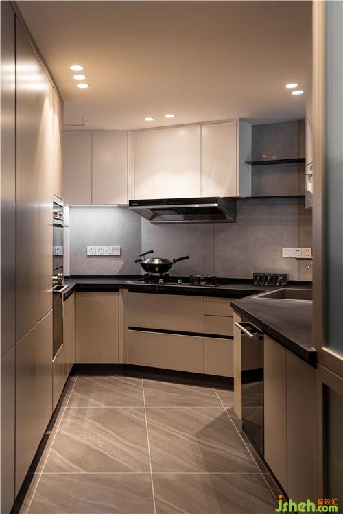 灰色柜門與黑色的操作臺,形成了顏色上的對比,打造出了空間的深邃與高級感,豐富了廚房空間的層次感.