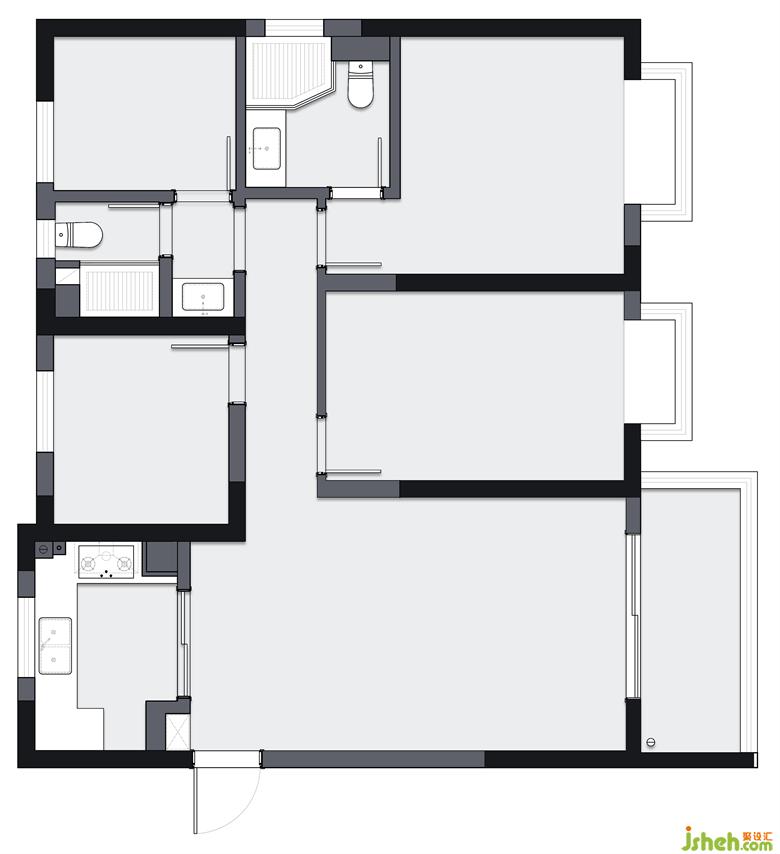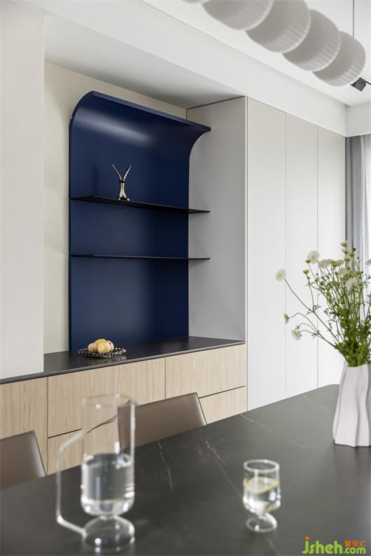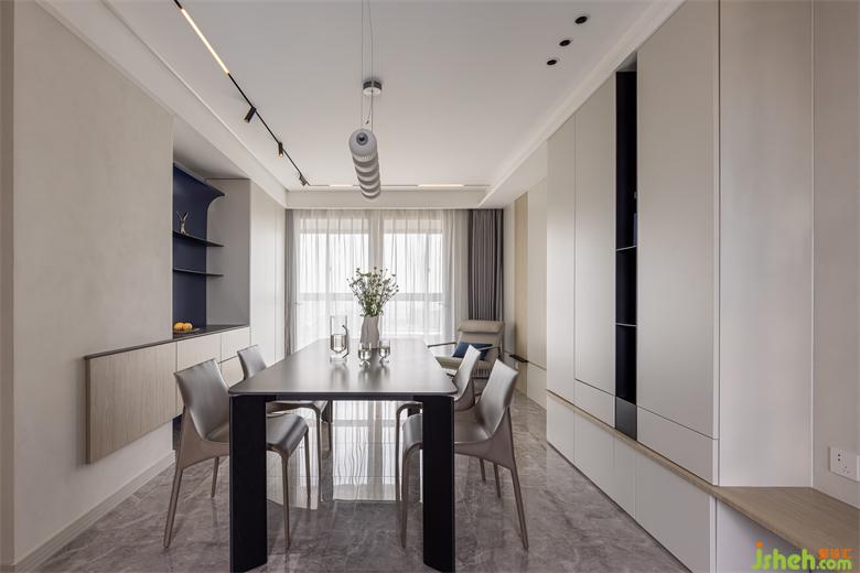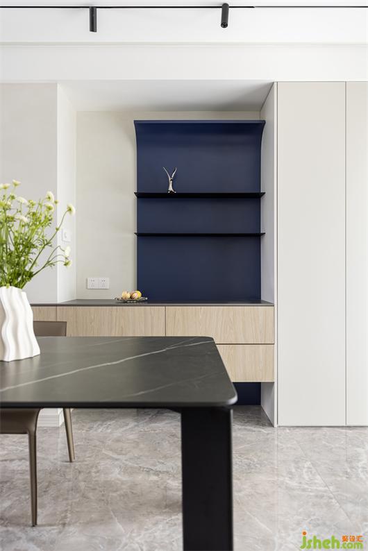 2. 設(shè)置獨(dú)立書(shū)房,門(mén)后墻體外擴(kuò),形成儲(chǔ)物柜,客廳一側(cè)形成餐邊柜與儲(chǔ)物柜,增加儲(chǔ)物空間