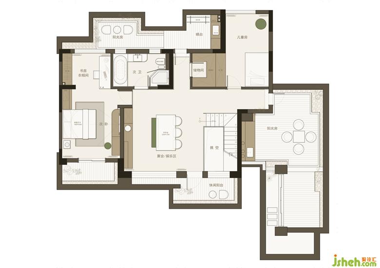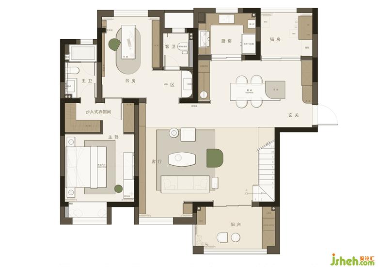 5. 主臥進(jìn)入睡眠區(qū)設(shè)置步入式衣帽間,將衛(wèi)生間與睡眠區(qū)進(jìn)行隔離,保證睡眠區(qū)的隱私性