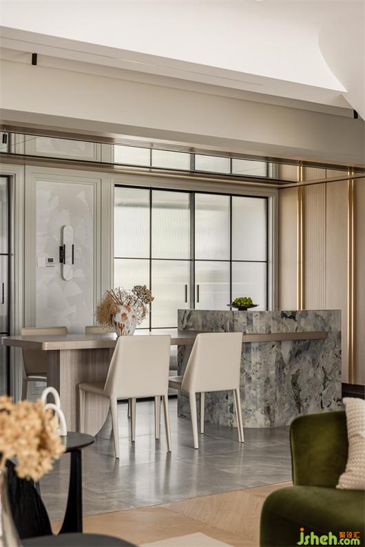 花漾美作餐桌與島臺(tái)合并的形式讓整個(gè)餐廳串聯(lián)起來,高低錯(cuò)落的設(shè)計(jì)豐富了家具的趣味性。