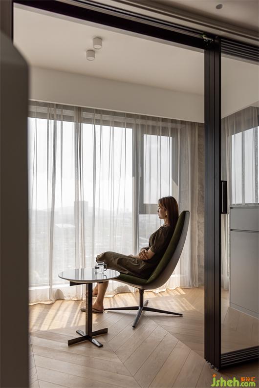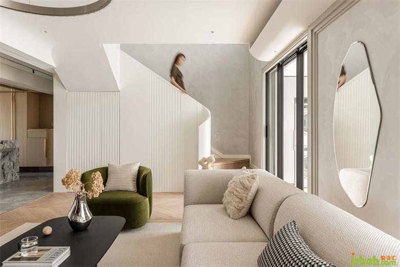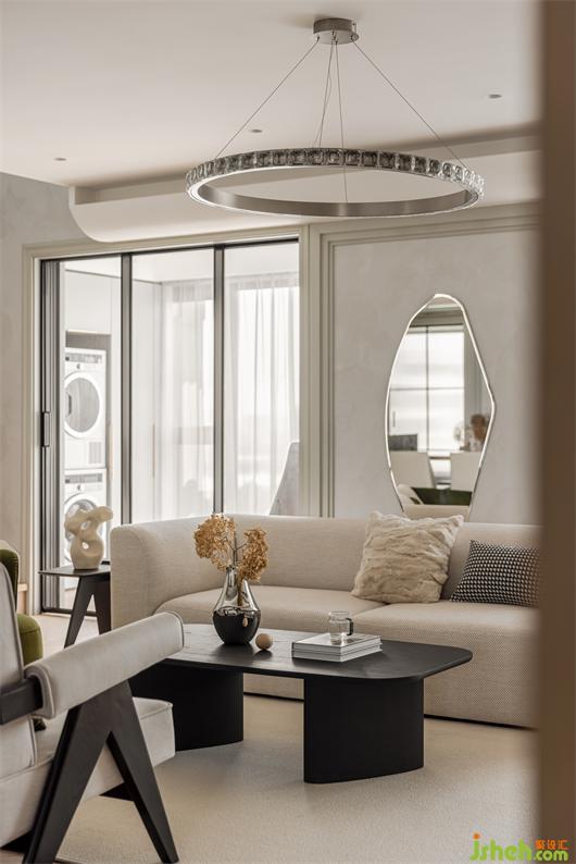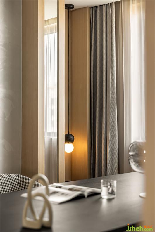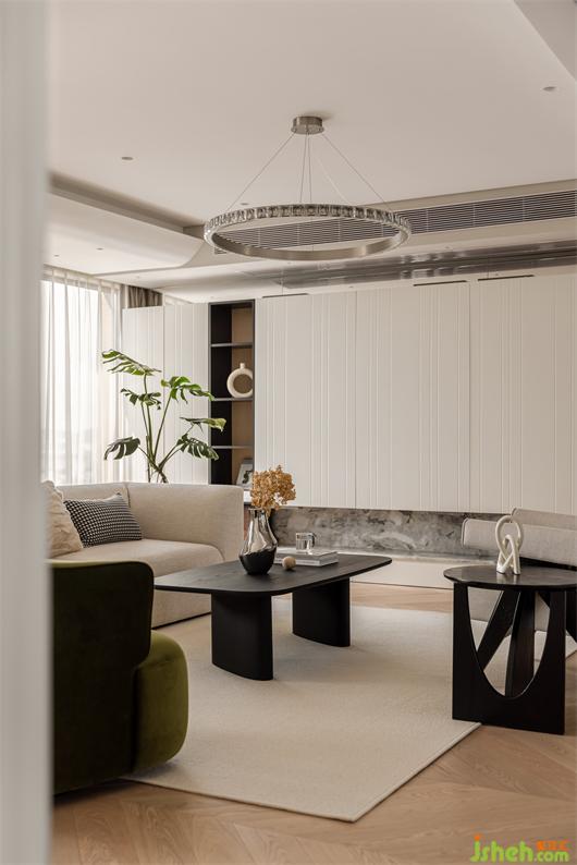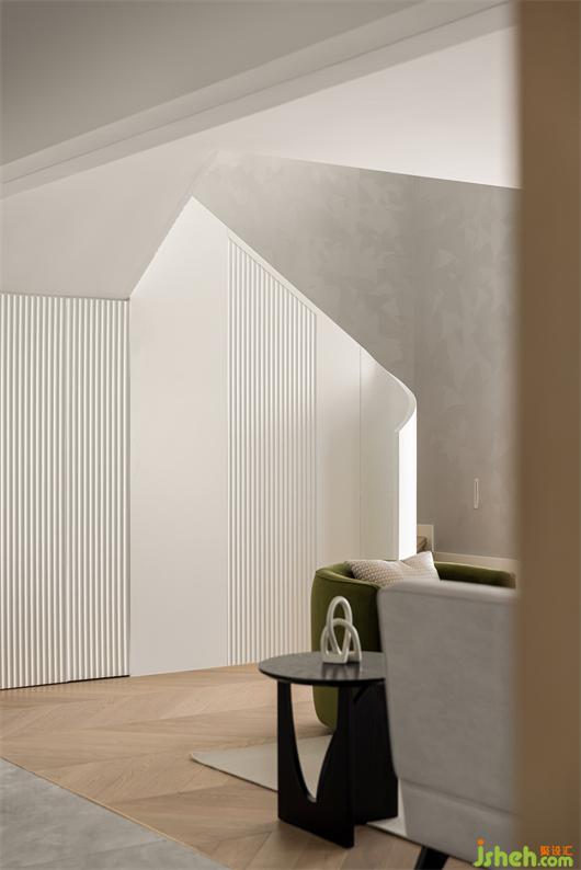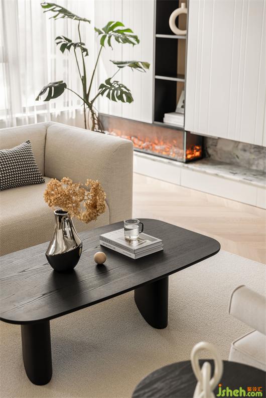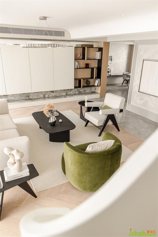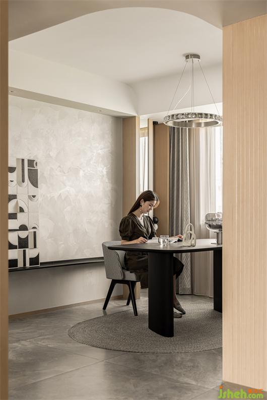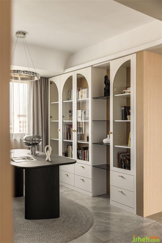 花漾美作弧形吊頂設(shè)計(jì)使視覺(jué)上更柔和,書(shū)柜同樣也是運(yùn)用圓弧處理手法,大量藏書(shū)有了安放之處,拾一本書(shū),品一壺茶,讓心靈在此處找到最舒適的狀態(tài)。