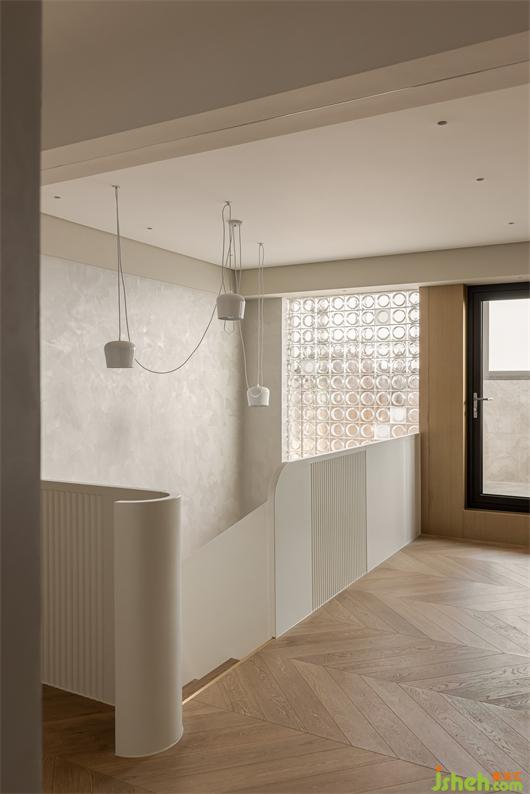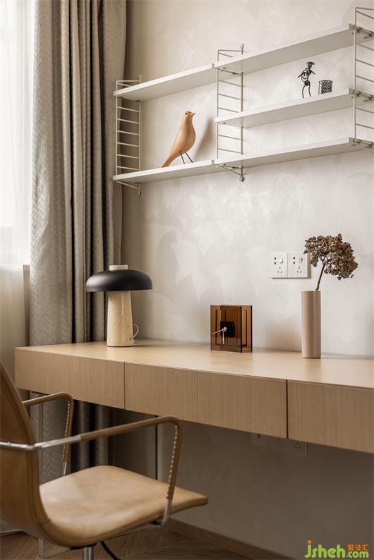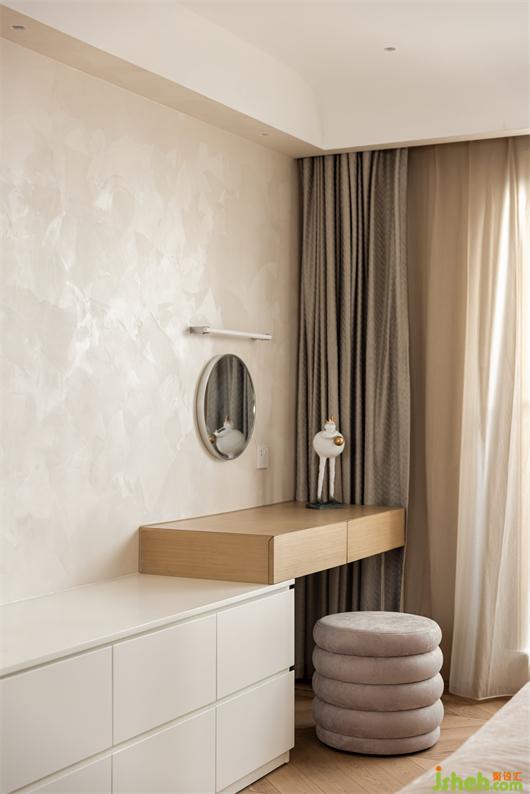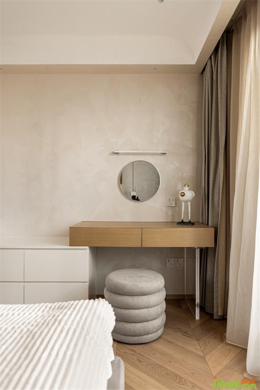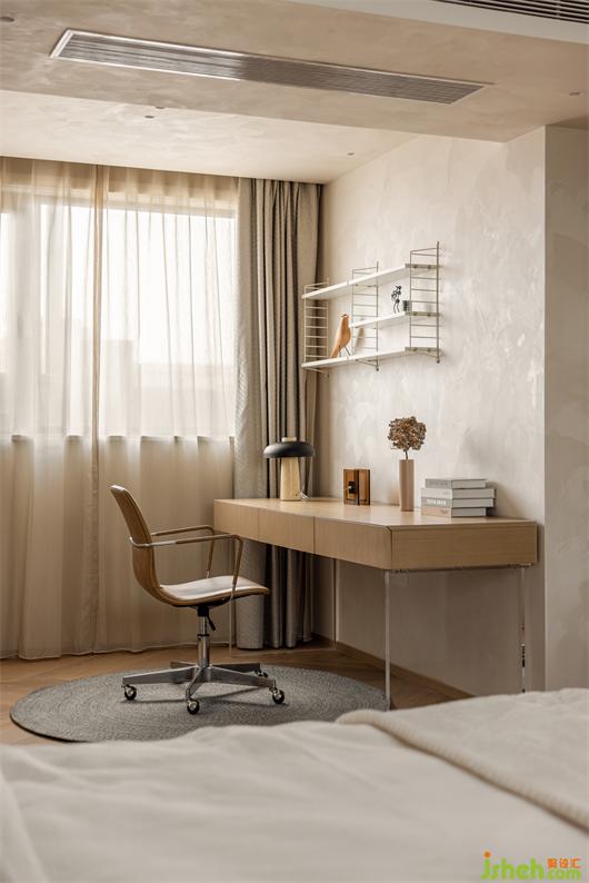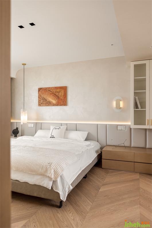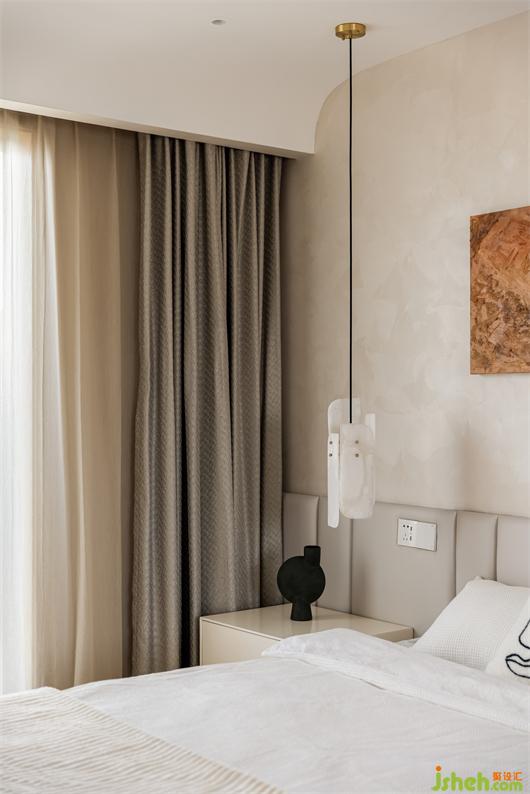 二樓主臥,藝術(shù)涂料包裹整個墻面,細膩的質(zhì)感,豐富了簡素的空間,床背不規(guī)則的軟包切割,有序的鋪成,花漾美作背景一幅暖橙藝術(shù)掛畫,清醒又獨立,如同暖冬里的陽光,投射進平凡的生活里。對空間、光線和線條的處理顯得游刃有余。