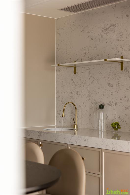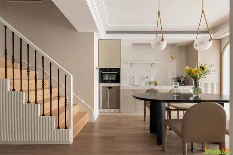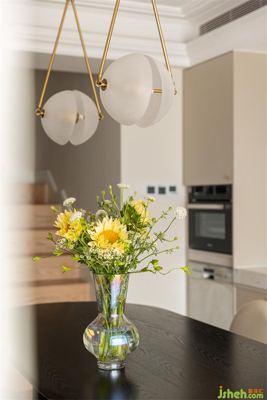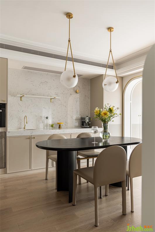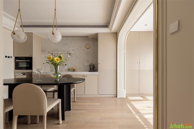 餐廳空間是原結(jié)構(gòu)的客廳位置,我們將餐廳與落地窗陽臺(tái)做融合,花漾美作將最好的采光給到餐廳,拱形門套框出窗外美景,西廚外置在餐邊柜一側(cè),功能性與美觀性兼具,現(xiàn)代風(fēng)格的餐桌椅與美式硬裝相結(jié)合,營造輕復(fù)古、內(nèi)斂、溫潤的空間氛圍。
