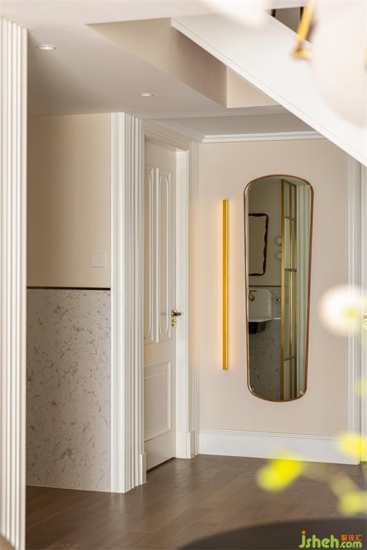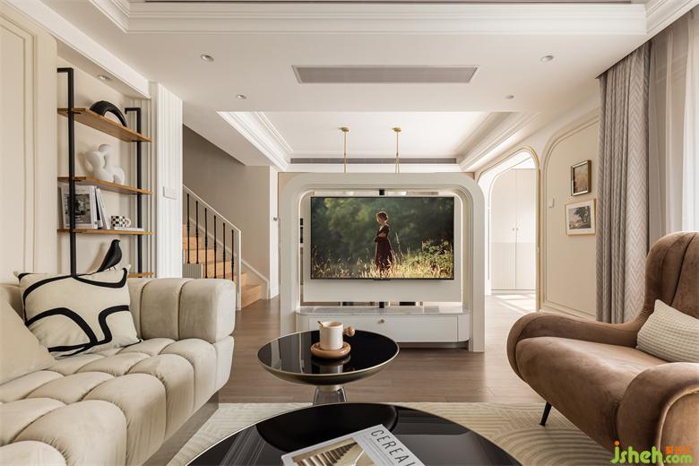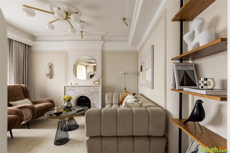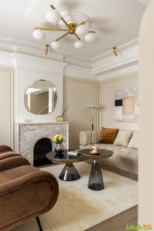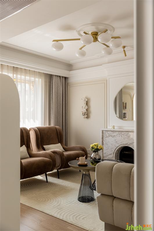 客餐廳之間設(shè)置一個360°旋轉(zhuǎn)電視架,花漾美作運(yùn)用了中軸對稱的設(shè)計理念,與大理石裝飾壁爐相呼應(yīng)布置,客廳圍合成經(jīng)典的對坐形式,高低組合鏡面質(zhì)感的茶幾現(xiàn)代時尚,木層板和鐵藝鋼架組合的展示架讓整個精致的空間增添了些許休閑氛圍。