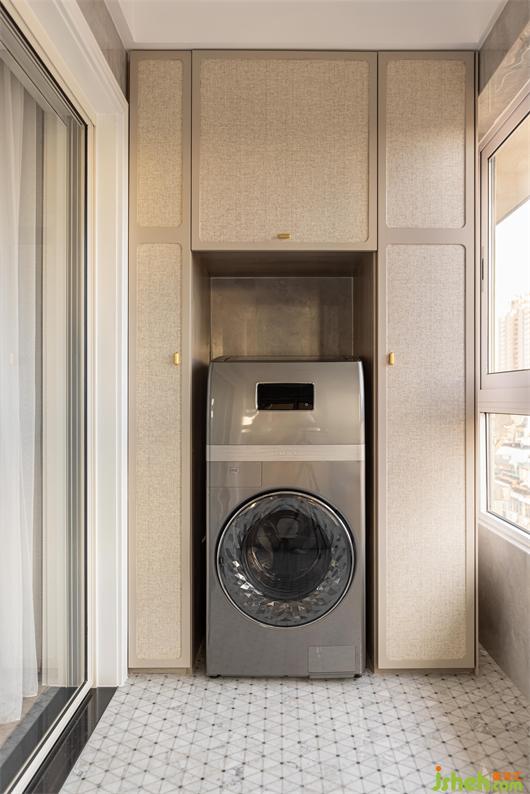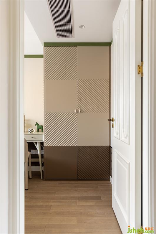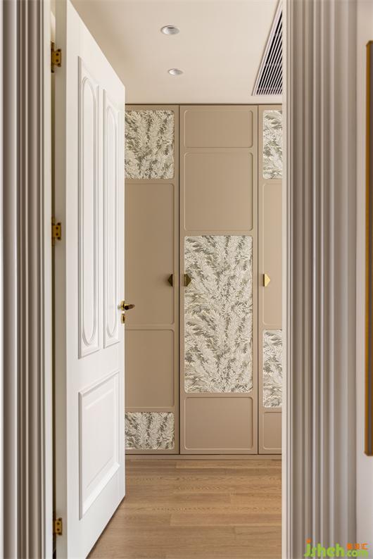 陽臺(tái)地面選用跟廚房衛(wèi)生間一樣的三角形大理石馬賽克地磚,配上淺咖色的門板,門板上的的弧角修邊,花漾美作讓原本功能性的空間柔和的恰到好處,內(nèi)凹的編織紋壁紙飾面讓原本單調(diào)的門板復(fù)古了起來。