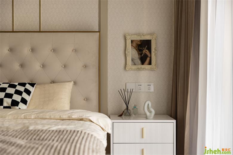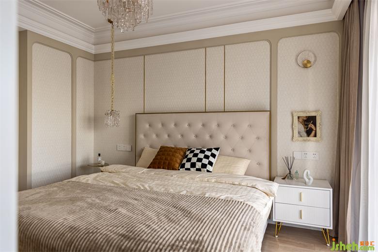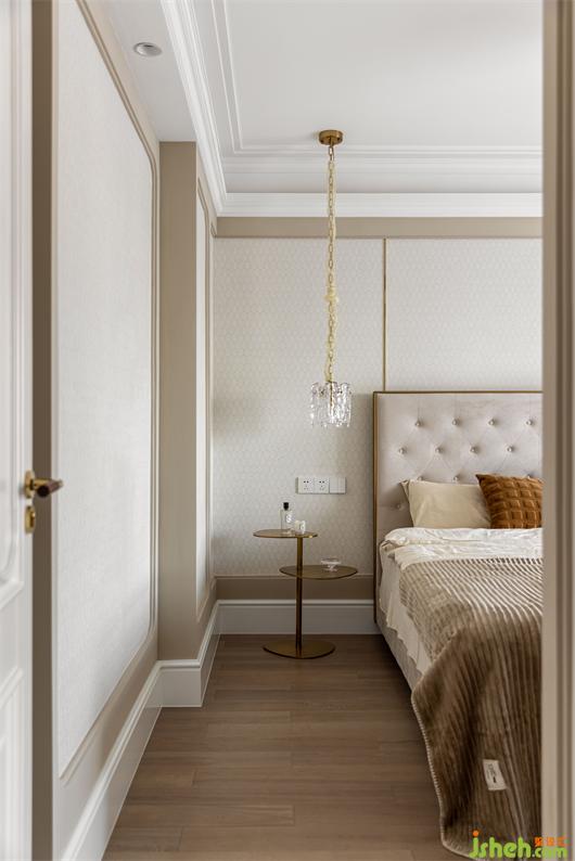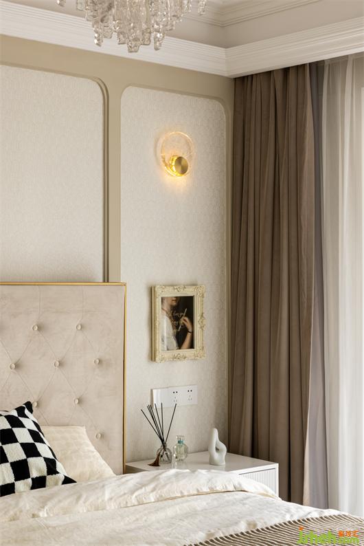 主臥是客餐廳的復(fù)刻,美式復(fù)古的硬裝和現(xiàn)代輕奢家居的融合,圓弧角的背景凹凸疊級(jí)作為裝飾護(hù)墻板,內(nèi)凹的淺紋壁紙飾面豐富了墻面的層次感,床背景幾根不銹鋼裝飾條的不規(guī)則排布,讓背景細(xì)膩有致,現(xiàn)代感的輕奢家具陳列,花漾美作為復(fù)古的底妝空間增添了精致度,朦朧夢(mèng)幻的水晶吊燈更是營造出晶瑩雅致的浪漫氛圍。