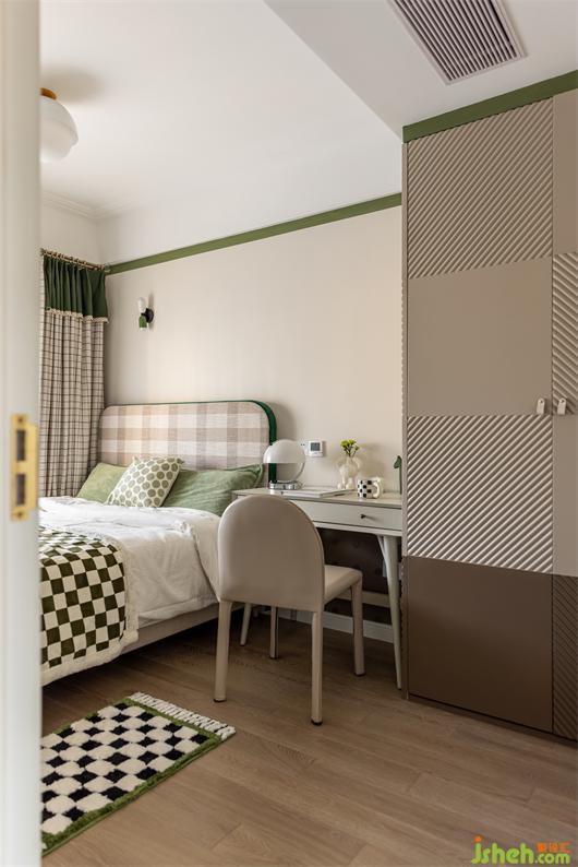 兒童房延續(xù)公共空間的主色,選配深綠+深棕的搭配,頂圈圍合深綠的勾邊,下墻群搭配波點(diǎn)棕色壁紙,讓整個(gè)空間構(gòu)建出童趣感,球狀的頂燈和壁燈呼應(yīng)了波點(diǎn)元素,波紋狀的方塊門板像拼圖一樣組合,簡單的衣柜也帶有美觀的裝飾感,灰格紋背景的床背與黑條格紋的窗簾,以及床品和地毯都形成了元素的相互呼應(yīng),三聯(lián)拱形書柜背板同樣搭配了波點(diǎn)壁紙,兒童房面積雖迷你,但是卻能兼顧功能和美觀,給孩子創(chuàng)造一個(gè)趣味美好的成長環(huán)境。
