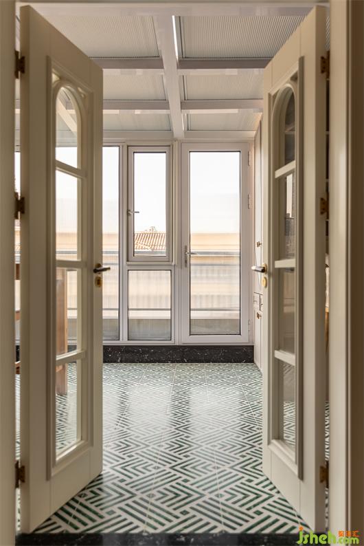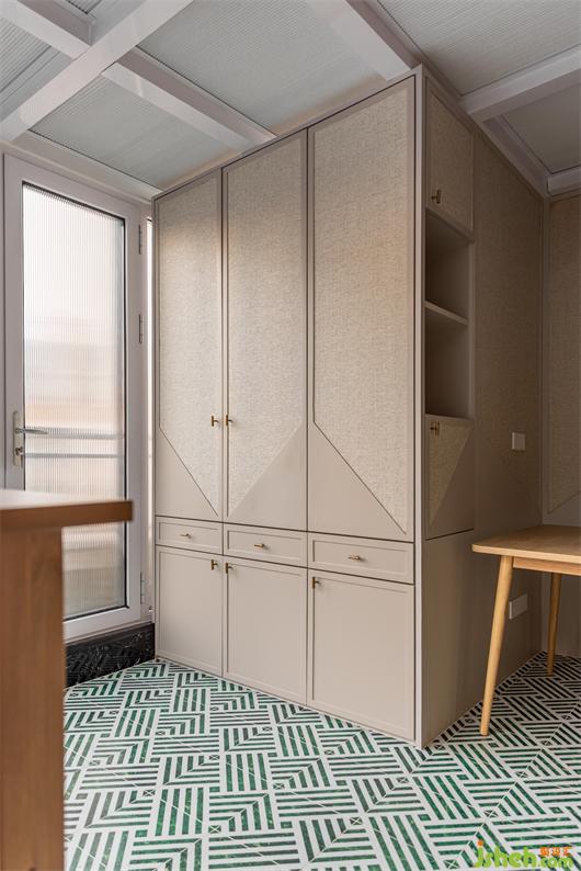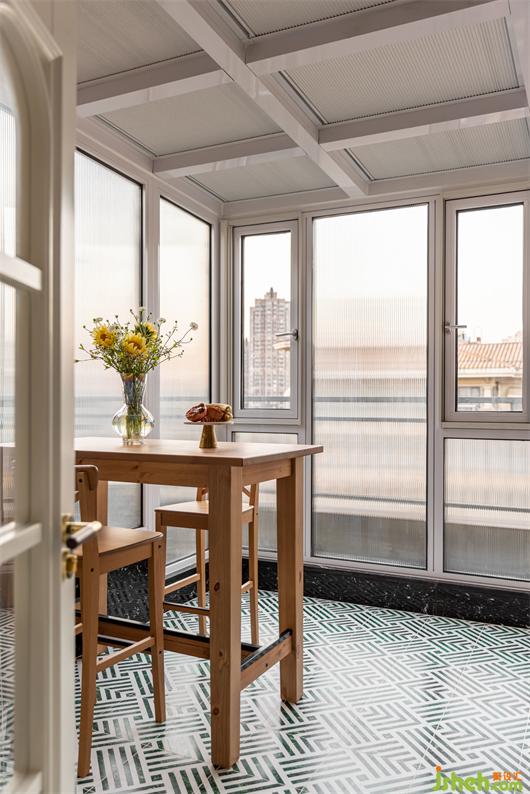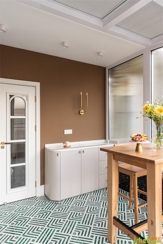 陽光房整墻頂幾乎都是玻璃,讓這個空間充享受了陽光的洗禮,長虹玻璃取代窗簾,讓光透進來的同時又很好的保護了業(yè)主的隱私,白綠相間的幾何圖案地磚趣味拼貼,摩卡色的墻面涂料為空間增貼些許南洋度假風味,內(nèi)凹的編織紋壁紙飾面讓原本單調的門板復古了起來。在這里跟家人暢享午后的休閑時光,多么愜意美妙。