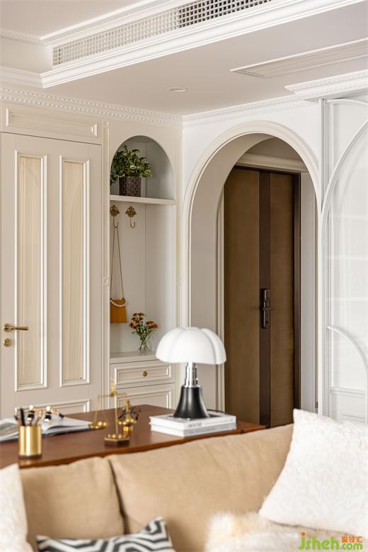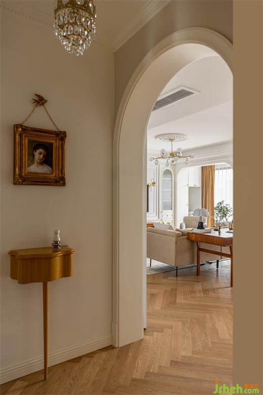 入戶正對的是法國畫家布格羅的女孩肖像油畫,做舊畫框與下方姜黃色的Zanotta單腿柜相呼應(yīng),南京裝修設(shè)計公司緊抓視線焦點(diǎn),給人奇妙的感官體驗(yàn)。法式拱門的優(yōu)雅弧線將一絲靈動帶入這個方正空間,也為步入客餐廳空間增加了儀式感。