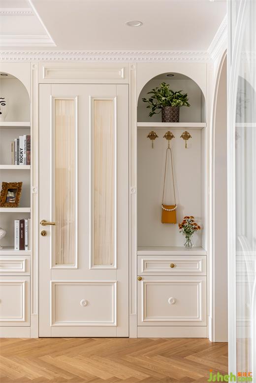 側(cè)面奶油色的到頂玄關(guān)柜,柜門中扇做全身鏡,南京裝修設(shè)計公司通過鏡面反光拉寬視覺效果,使較為緊湊的門廳區(qū)域視覺上更顯寬敞明亮。底部預(yù)留的換鞋空間與感應(yīng)燈帶讓門廳功能性與美觀并存。