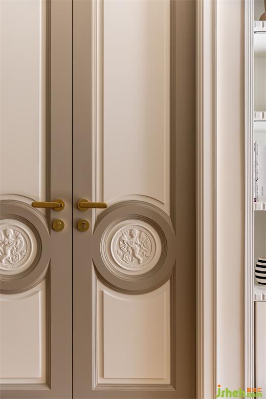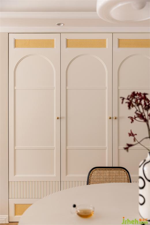 鞋柜融合卡座設計,內部有掛衣區(qū)和鞋帽區(qū),外部設計開架及抽屜,花漾美作方便業(yè)主多方位儲物需求,疊級門板搭配金屬把手及藤編元素提升了空間的活力。