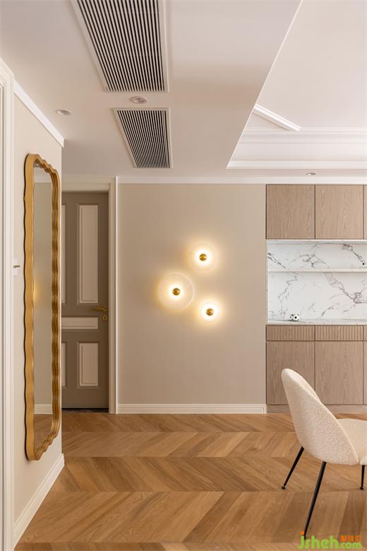 花漾美作入戶對面的組合壁燈讓人眼前一亮,夜幕降臨,柔和的燈光散發(fā)出氤氳的光圈,餐廳充滿了浪漫詩意的就餐氛圍。