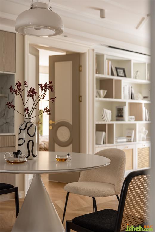 南北貫通的客餐廳采光良好,無論是圍坐的沙發(fā)區(qū)還是圓桌就餐區(qū)皆呈現了其樂融融的家庭氛圍??ㄆ渖⒛炭?、白色,點綴木色及藤編元素營造了休閑溫馨的家居場景。