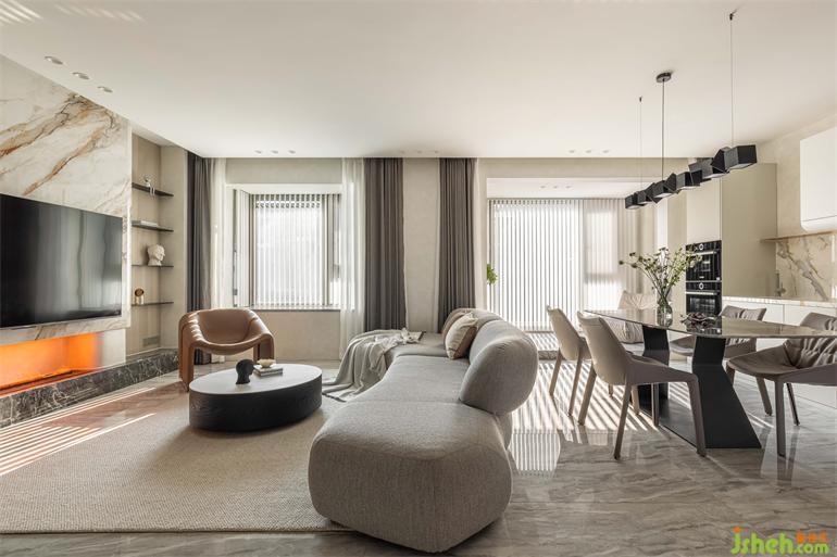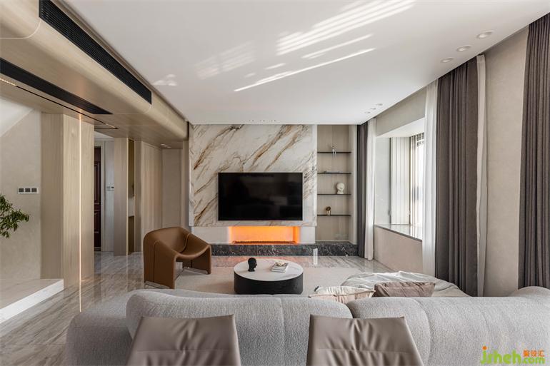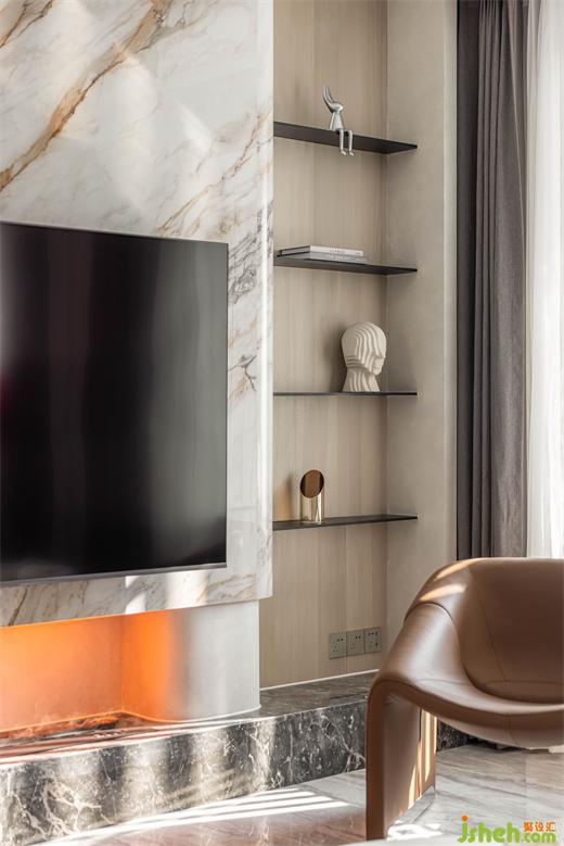 電視墻采用巖板熱彎工藝,南京家裝設(shè)計(jì)沉靜溫潤(rùn)的石材與下方壁爐躍動(dòng)的火苗相映成輝,既動(dòng)且靜,自成一景。