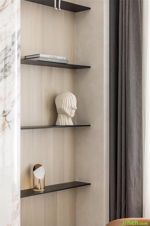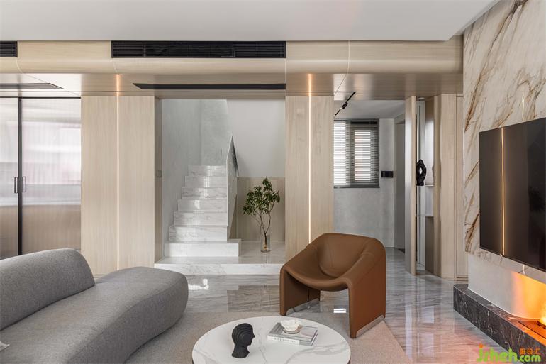 墻面木色延伸至頂,增加空間縱深感,南京家裝設(shè)計(jì)墻面內(nèi)嵌線性燈,功能性與裝飾性相結(jié)合。