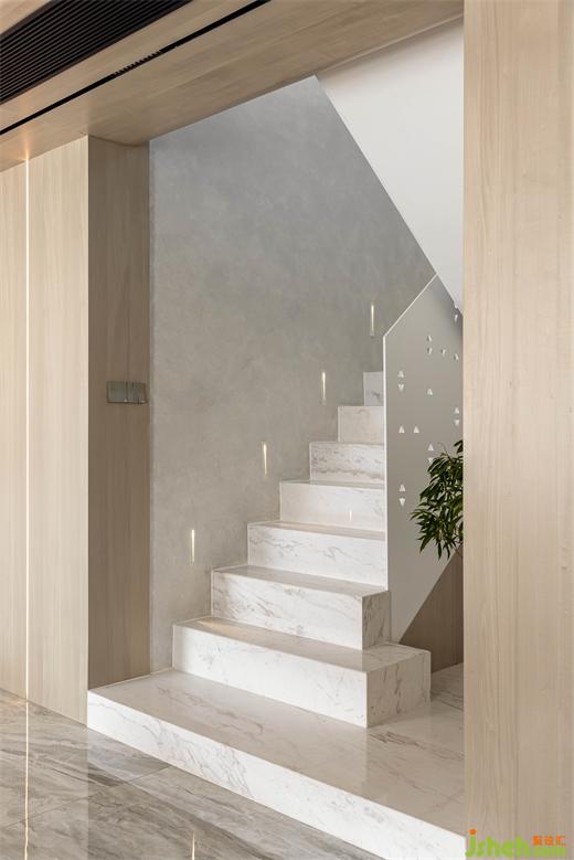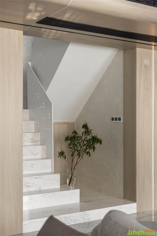 定制的鐵藝鏤空扶手,讓樓梯區(qū)域更加輕盈通透,感應(yīng)踢腳燈令上下樓更為便捷。