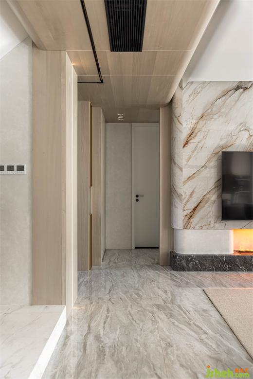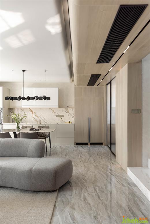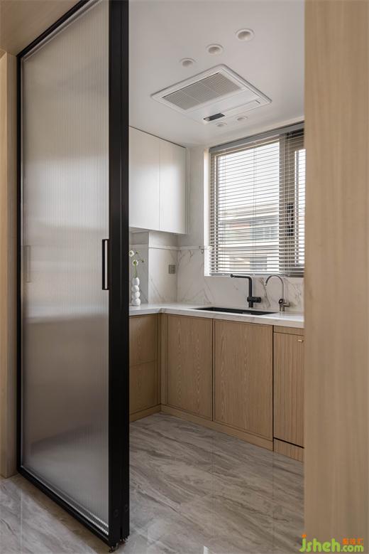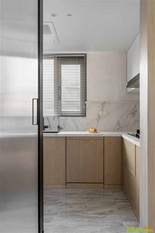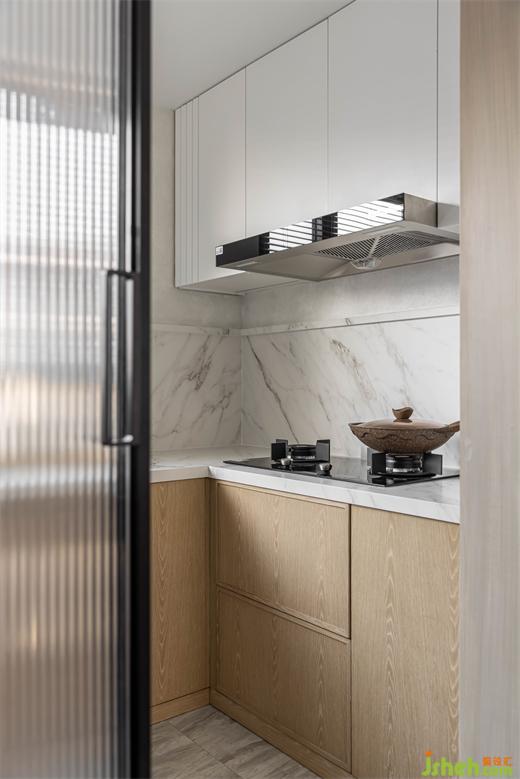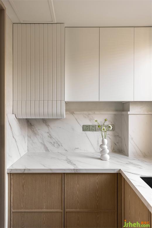 臺面巖板延伸上墻,豐富空間層次感。南京家裝設(shè)計內(nèi)嵌冰箱與墻面木紋同色,在空間上保持了一致性。