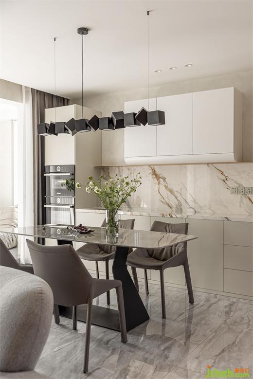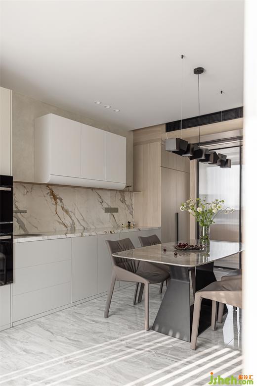 鐵藝長虹玻璃推拉門,既能消減廚房臺面的雜亂感,又保證了餐廳采光不受阻擋。藝術(shù)涂料與石材結(jié)合的墻面與柜門造型處處彰顯設(shè)計巧思。