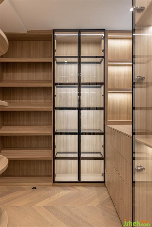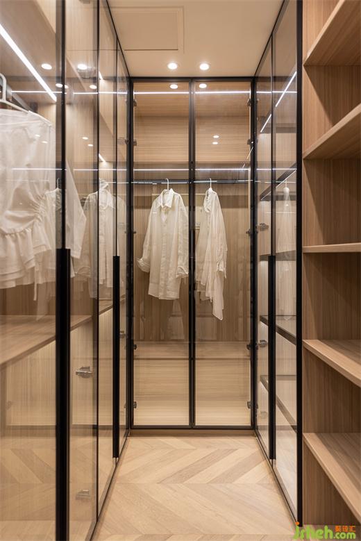 獨(dú)立衣帽間設(shè)計(jì)大面積掛衣區(qū),南京家裝設(shè)計(jì)同時(shí)兼顧包包與鞋子,內(nèi)置燈帶物品一目了然,收納更省心。