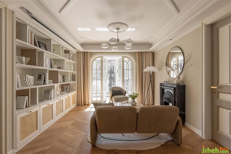 1. 客廳書(shū)柜、壁爐、沙發(fā)圍坐休閑感