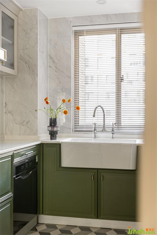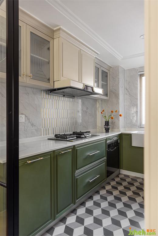 黑色細邊玻璃推拉門造型簡約,最大限度引入北向采光。裝修設(shè)計墨綠色櫥柜與六角花磚、白色瓷盆與銀色不銹鋼龍頭搭配時尚又復古,玻璃柜門點綴銀色勾邊細節(jié)滿滿。