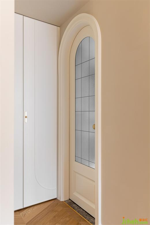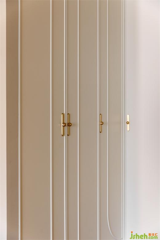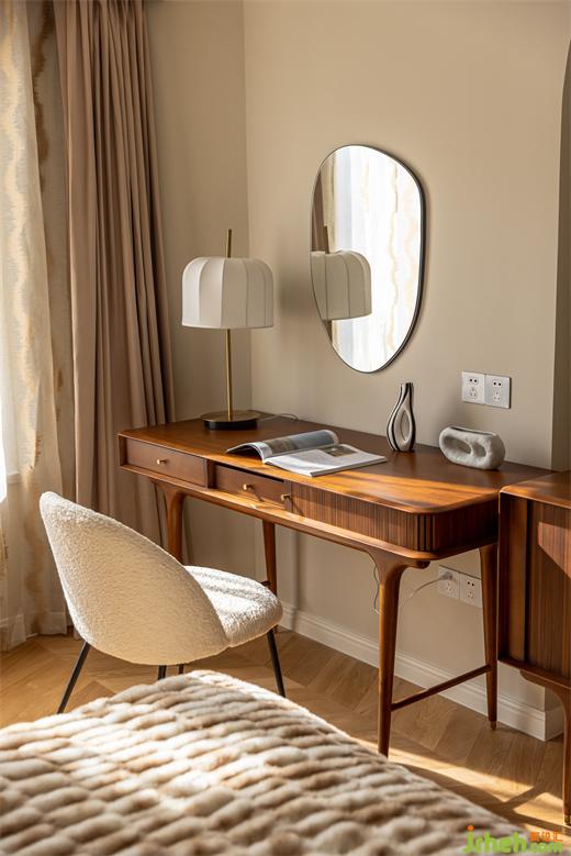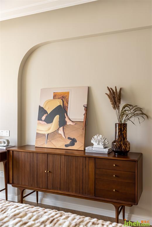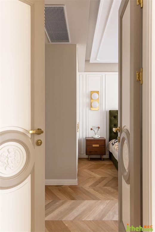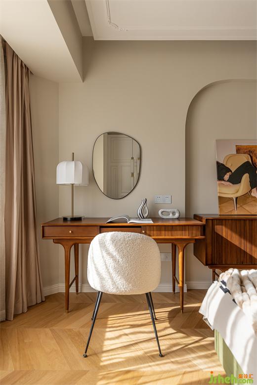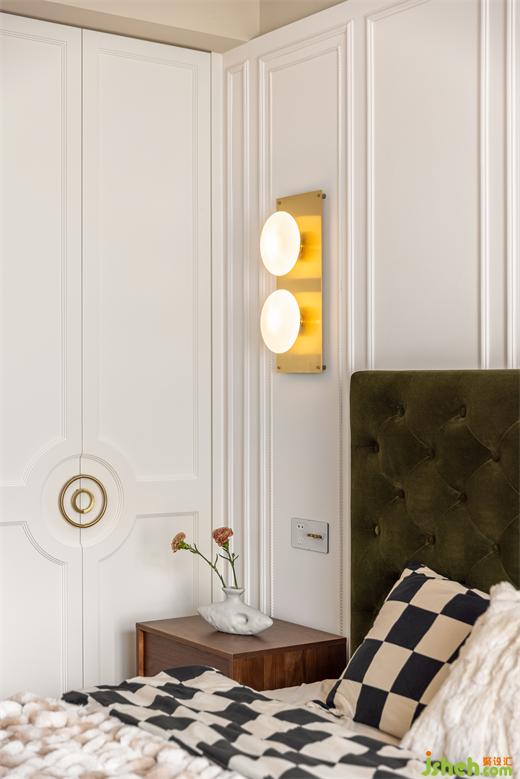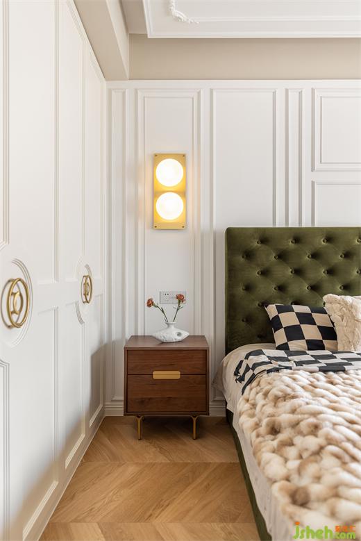 主臥延續(xù)客餐廳柔美的淺色系,綠色絨布床與棋盤格床品搭配復古典雅,裝修設(shè)計深紅色柚木梳妝臺與邊柜紋理通直,色澤光亮,黃銅色燈具與柜門金屬把手點綴精致感,臥室呈現(xiàn)出一種浪漫優(yōu)雅且溫柔動人的氣場。