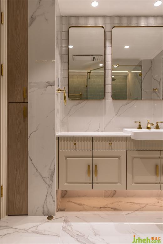馬賽克小白磚和綠磚作為吸睛點,金色系五金件區(qū)別于主衛(wèi),設(shè)計巧思盡顯。