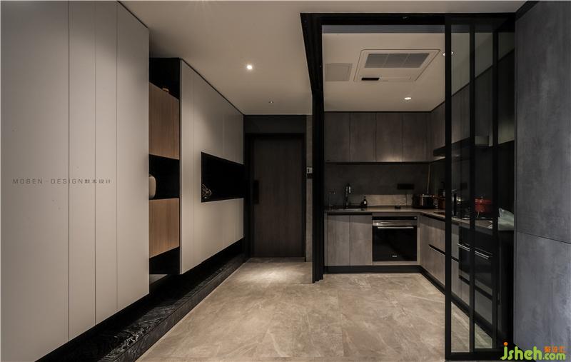 入戶收納柜是電視背景的延伸設(shè)計,整體懸空