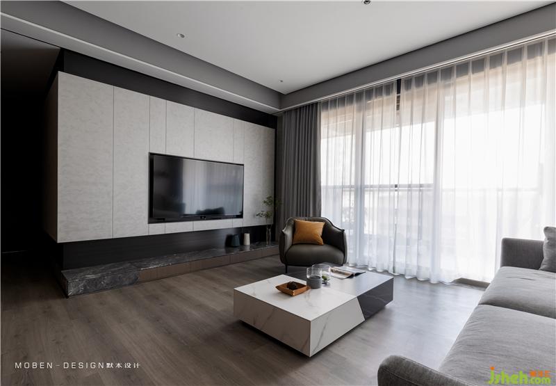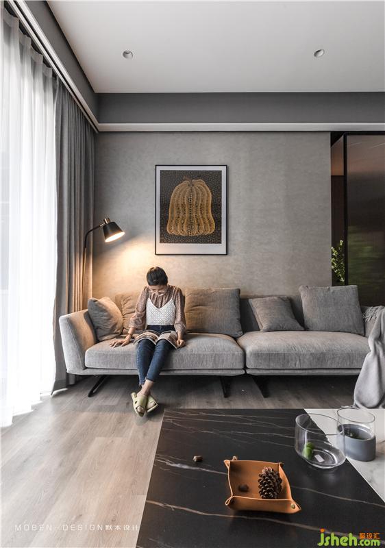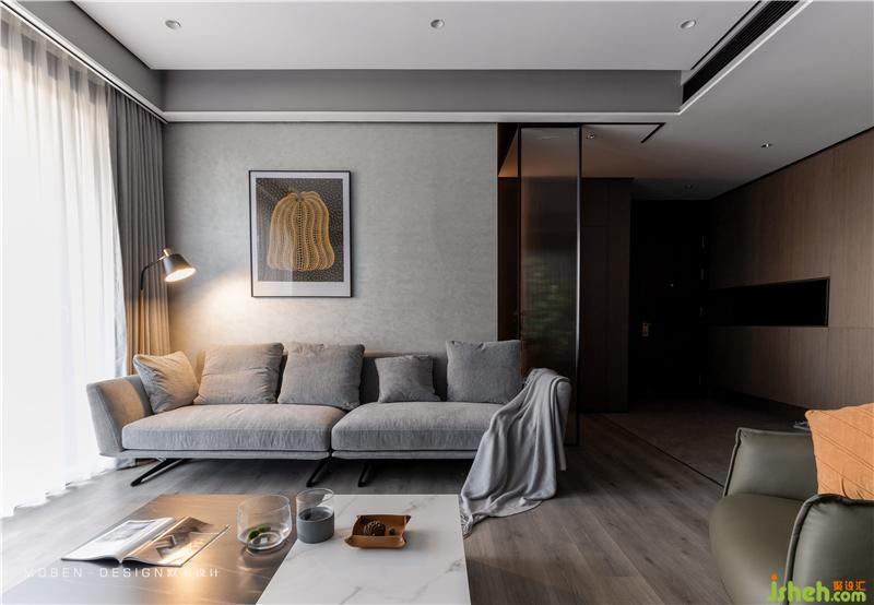 灰色L型主體背景,側(cè)面延伸進(jìn)過道,從視覺上拉長整體比例感