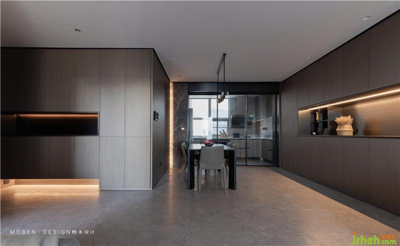 地面黑色不銹鋼收邊條、墻面隱形門門縫、天花不銹鋼和地面的分割呼應(yīng)、讓整體空間得以貫通