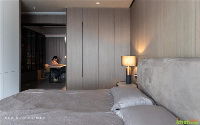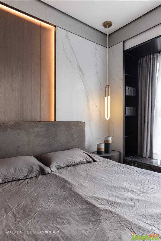 床頭背景使用轉(zhuǎn)折延伸的設(shè)計(jì)手法,低調(diào)有氣質(zhì)
