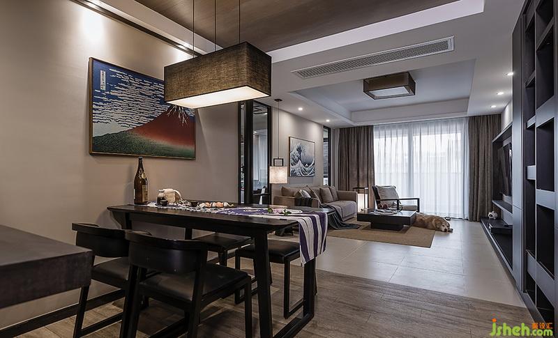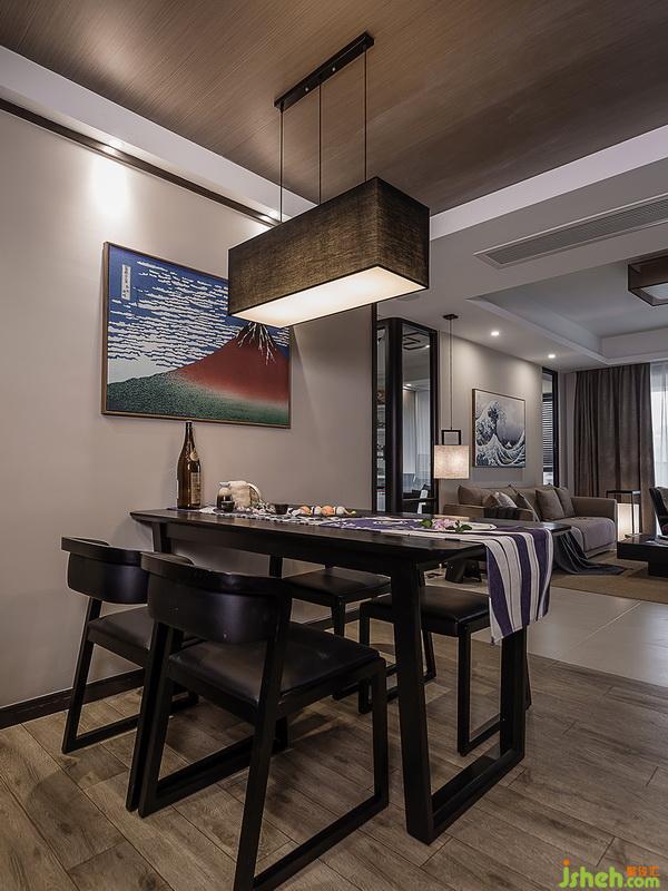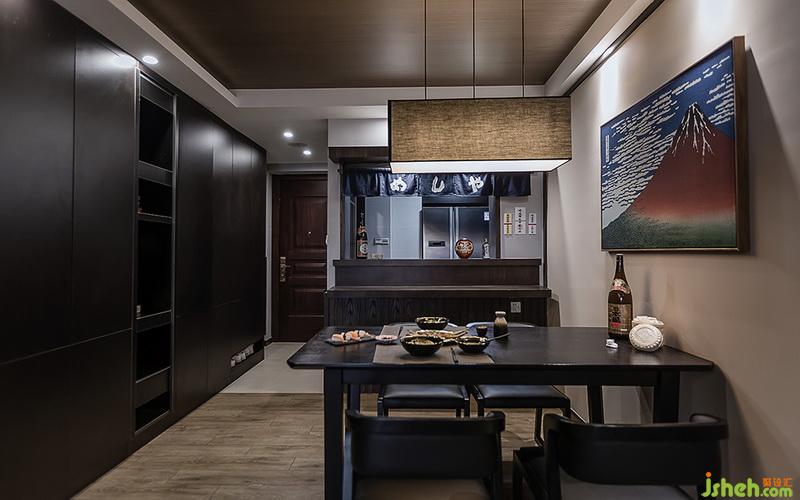廚房和餐廳之間居酒屋的設(shè)計(jì)靈感來自近兩年大熱的溫暖日劇《深夜食堂》。設(shè)計(jì)公司這樣的一個(gè)設(shè)置既豐富了日式的主題概念,也是廚房與餐廳之間互動(dòng)的橋梁。做飯不僅僅是一個(gè)人的家務(wù),也可以是多人的有趣互動(dòng),站在廚房能夠清楚明白的和餐廳的親朋好友進(jìn)行對(duì)話,端菜也不用進(jìn)出來回跑腿,只需要通過這個(gè)小“酒臺(tái)”就可以輕松遞至餐廳。也可以當(dāng)作一個(gè)小酒吧來使用,具有家庭情趣,實(shí)用也非常符合主人的審美。