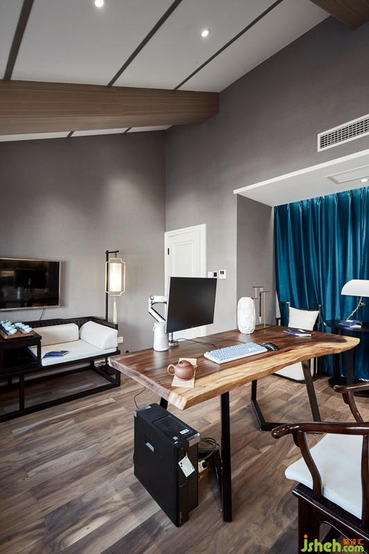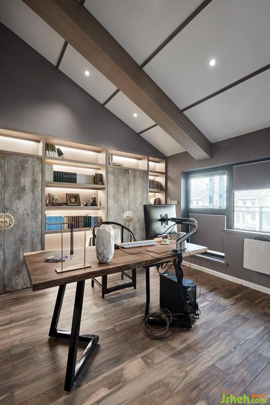 書房的整體風(fēng)格室內(nèi)設(shè)計(jì)師也是貫徹了時(shí)尚中式的概念,斜屋頂?shù)脑煨屠昧嗽柬斆娴男泵嬖煨?,原始粱通過用木飾面的包覆加上線條的塑型,反而將缺點(diǎn)變成一個(gè)獨(dú)特的特點(diǎn),家具造型簡約卻透著一種古韻,整體和諧自然。
