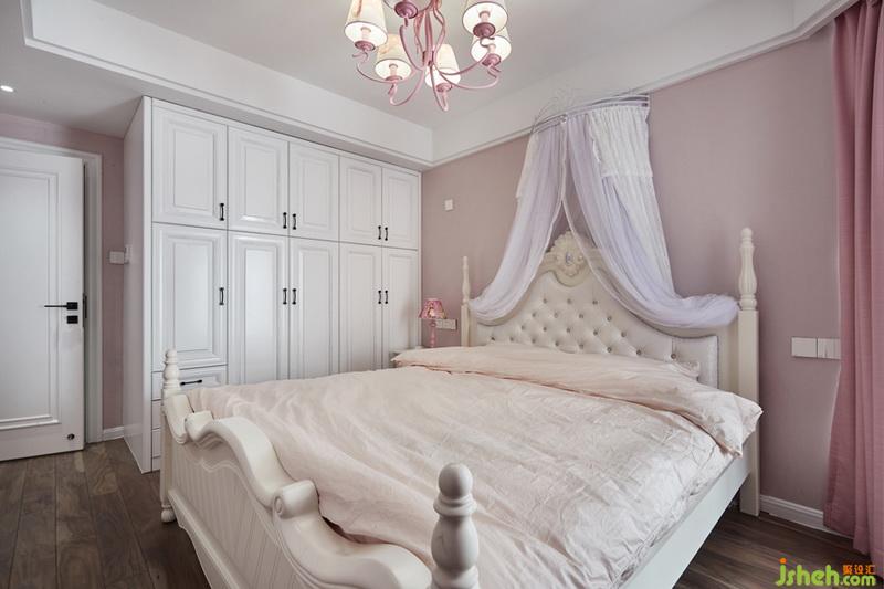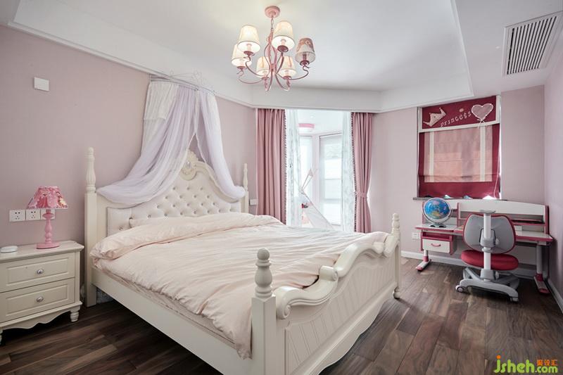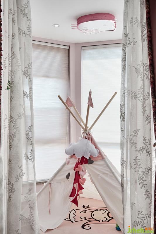 小孩房整體走公主風(fēng),純白與粉色的結(jié)合,夢幻中帶著孩子的童真,非常討喜,游戲區(qū)的小帳篷帶著自然萌,相信小主人在這樣一個(gè)空間休息與玩耍也一定十分的幸福開心。