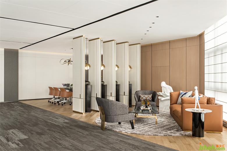 在遠(yuǎn)洋新干線辦公的入口,辦公室設(shè)計師通過垂掉的玻璃燈柱,構(gòu)建了一幅山型立體面,營造深遠(yuǎn)莊重的氣勢;整個空間具備領(lǐng)導(dǎo)辦公、員工辦公、開放會議區(qū)、茶歇區(qū)、等候區(qū)、高爾夫娛樂體驗區(qū)的幾大辦公功能;在材料的選擇上,以玻璃和金屬的穿插點綴,提升辦公空間的藝術(shù)格調(diào)與輕奢感,米色與橙色的碰撞,形成輕松、自由的空間形態(tài)。