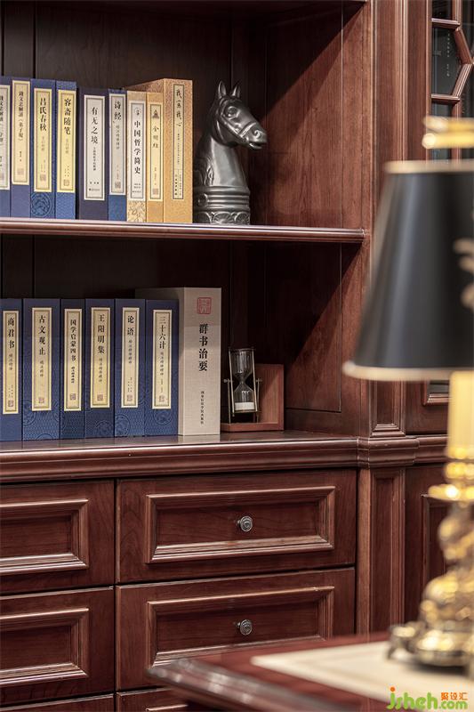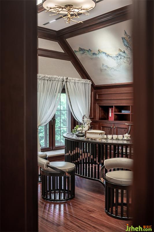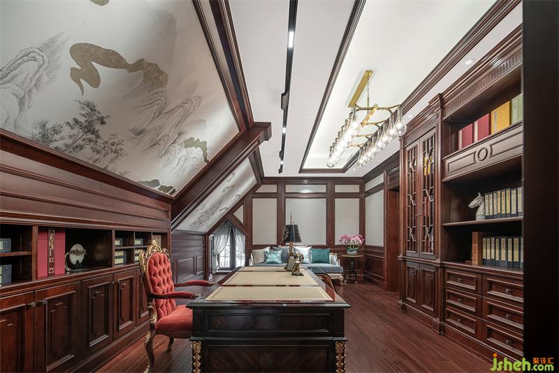 從閣樓推門而入,古典書香氣息撲面而來,書房的別墅設計請不過分強調(diào)繁復的雕刻與細節(jié),背靠著祥云和山水組合而成的墻畫,原木營造文雅詩意與深邃場景的豐富感,這里是一處獨享的空間。
