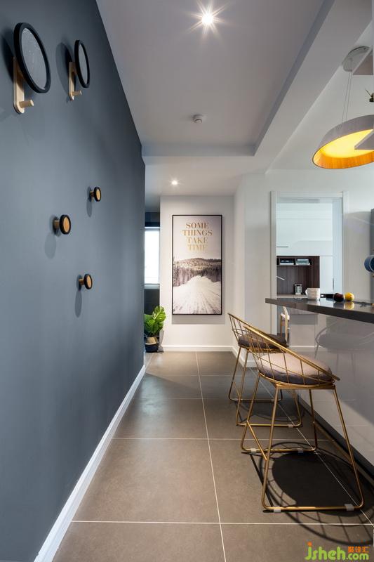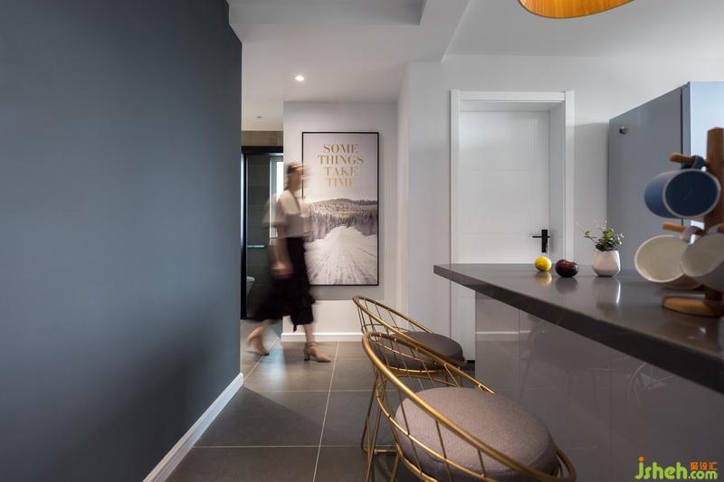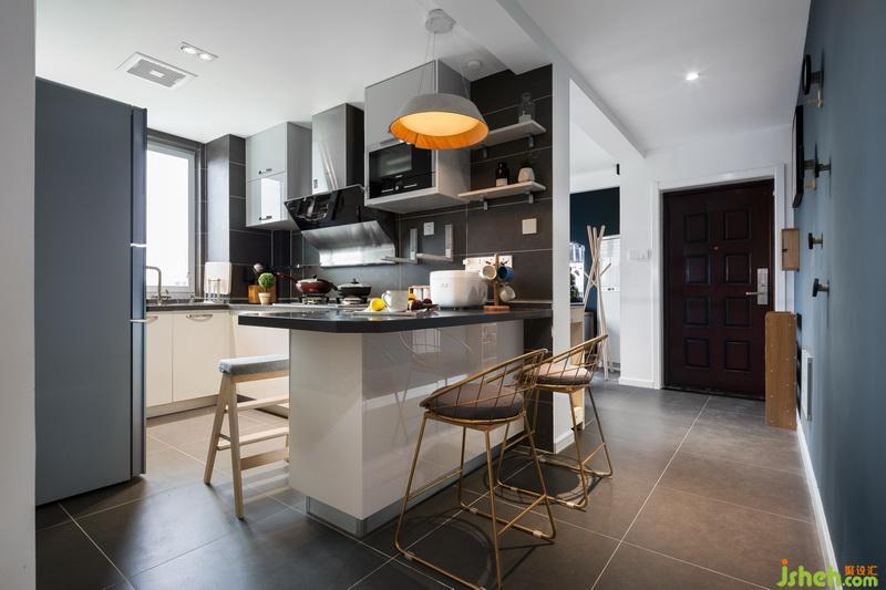 戶型沒有獨立的餐廳空間,而開放式廚房的設(shè)計,增加了過道的采光,吧臺的設(shè)計,可以容納4-5人同時用餐。